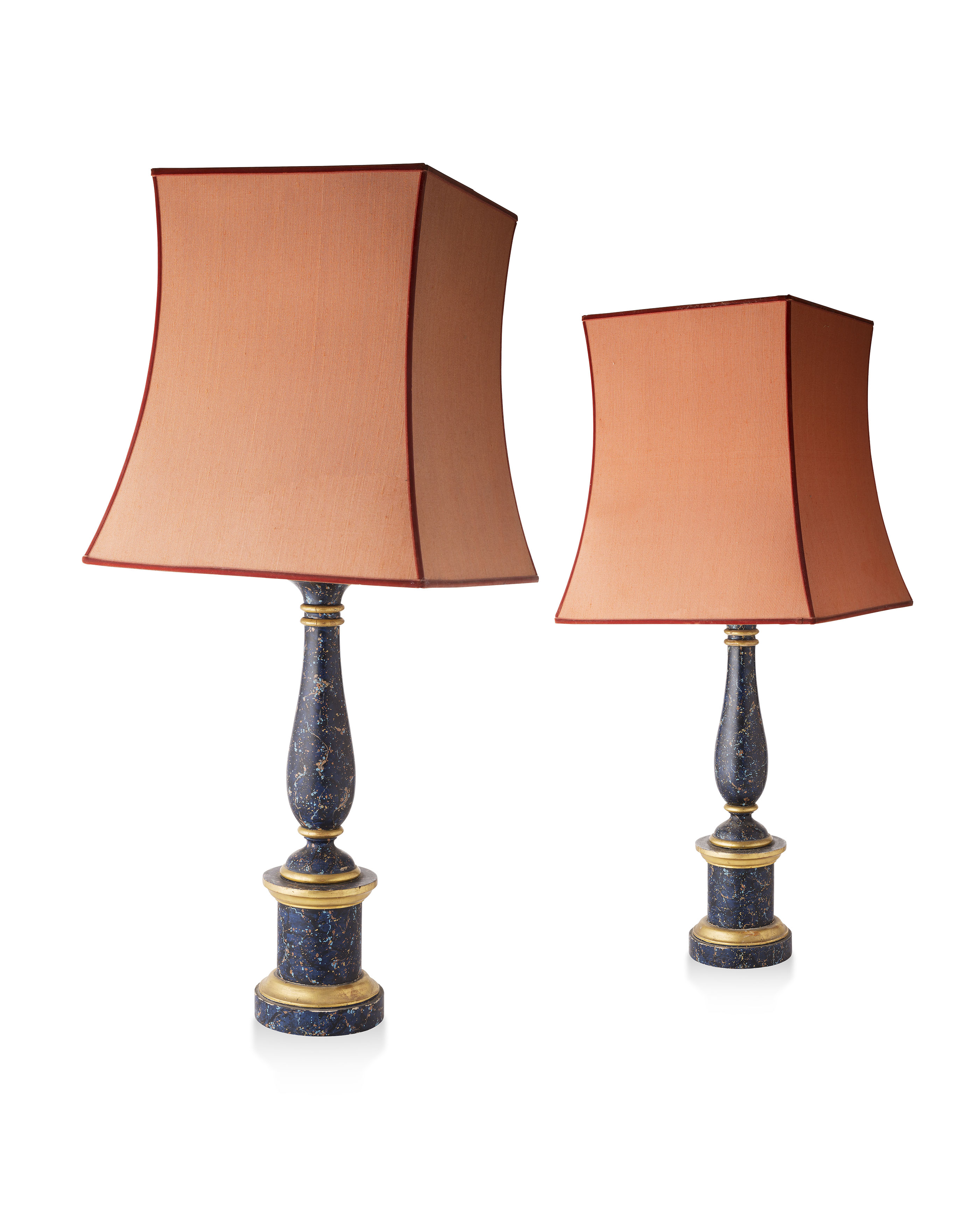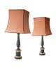 each knopped baluster column raised on a cylindrical base, decorated with splashes of colour on a dark blue ground with gilt highlights, with a shade (2)