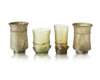 both of slightly waisted form with a single thread band, on a short foot, 11.5cm and 11cm high; together with TWO GREEN GLASS BEAKERS, possibly Rhenish, with single thread bands and applied drops, 10.5cm and 9cm high (4)