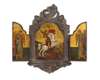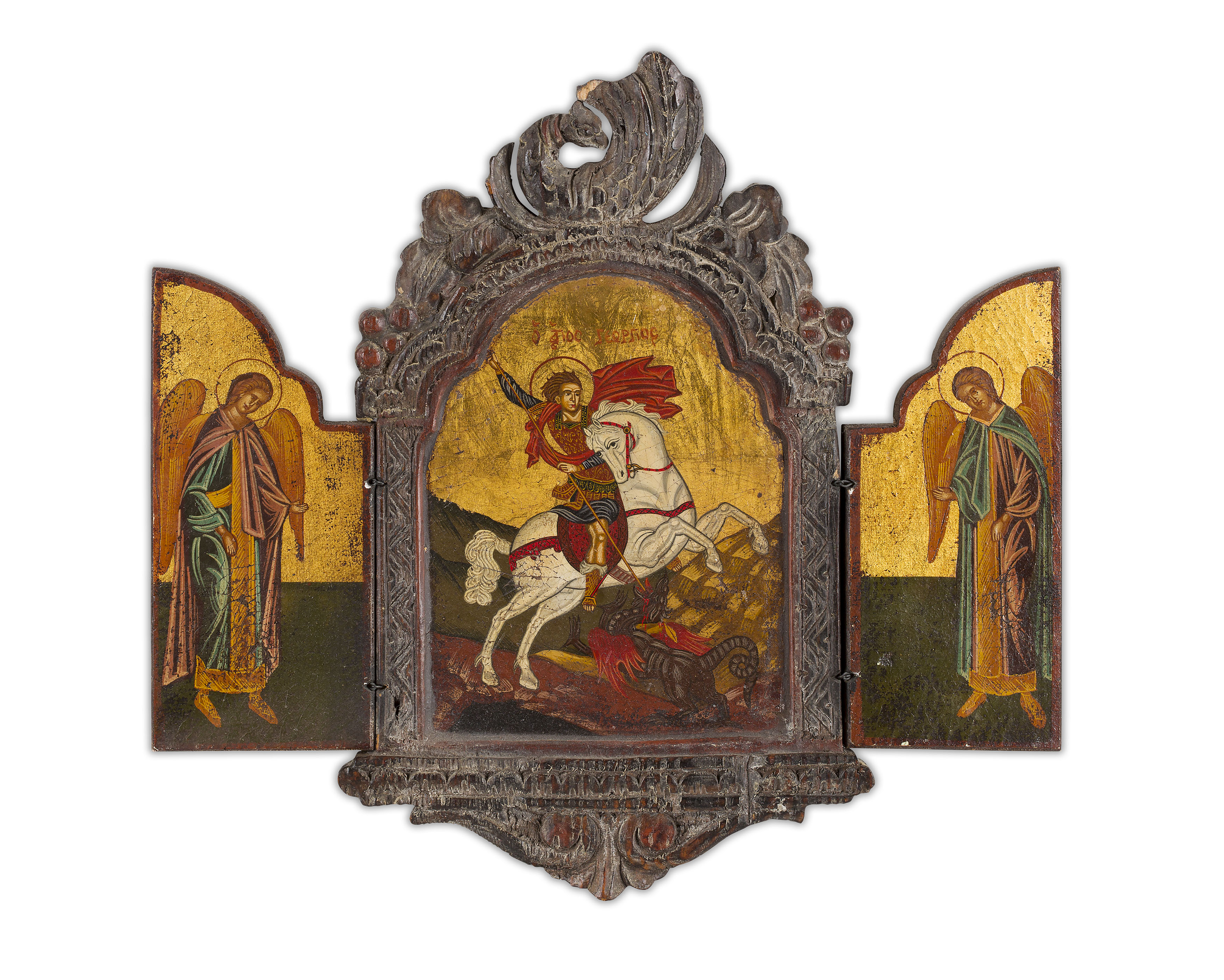 painted in gilt and coloured enamels, the central panel depicting St George flanked by side panels with angels, the whole enclosed in a carved frame