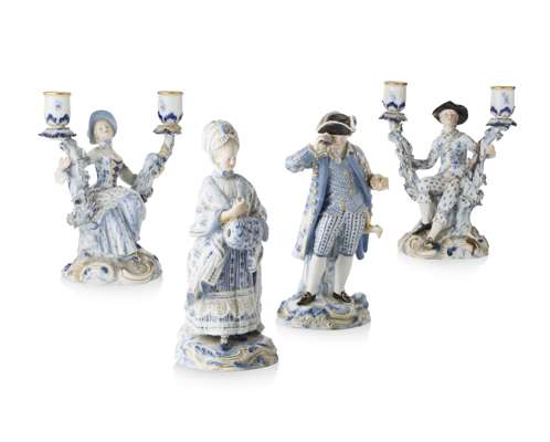 comprising a pair of twin branch figural candelabra raised on rococo style bases, 20.5cm high; and a pair of figures, modelled as gentleman with a telescope and female companion, 20.5cm high, all with blue crossed swords marks and inscribed numbers (4)