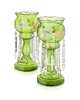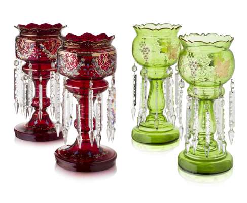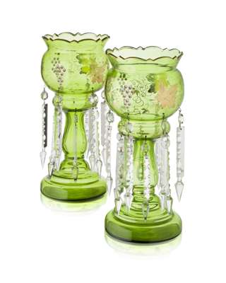 each with circular enamelled bowls with lustre drops raised above knopped columns and spreading bases, raised on ebonised plinths under glass domes, 37cm high; together with PAIR OF VICTORIAN GREEN GLASS AND GILT DECORATED GIRANDOLES, 19th century, each with circular bowls with lustre drops raised above baluster columns and spreading bases, 34.5cm high (4)