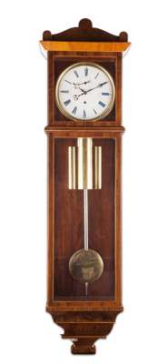 serial no. 657381, the opaque milk glass dial with blue Roman numbers and a subsidiary seconds dial, and triple cylinder weight and pendulum in a walnut six glass case with a scroll pediment and pendant