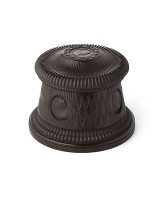 the circular fluted and ogee moulded cover centred by a carved profile portrait medallion of Mozart, above a body with tapering sides with four further carved portrait roundels depicting Beethoven, Handel, Hayden, and Jenny Lind, on a moulded circular foot