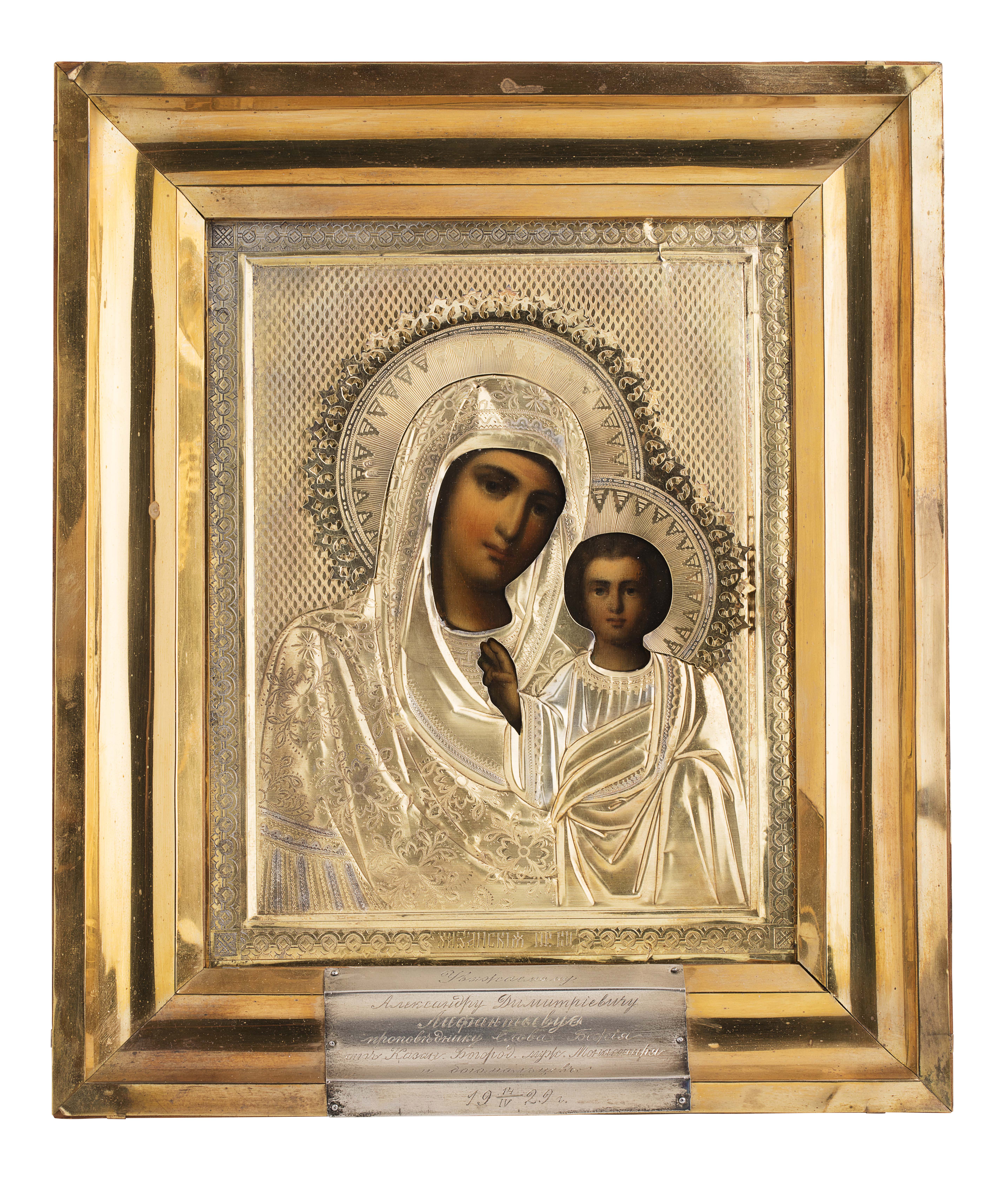 within a silver gilt and enamelled oklad, bearing stamped maker's mark in Cyrillic, and bearing later plaque translated as 'TO THE RESPECTED ALEKSANDER DMITRIVICH LIFANTOYER/ PREACHER OF THE WORD OF GOD/ FROM THE MONKS AND LAITY/ OF THE KAZAN MOTHER OF GOD MONASTERY/ 14 APRIL 1929', in a wood case with glazed hinged cover
