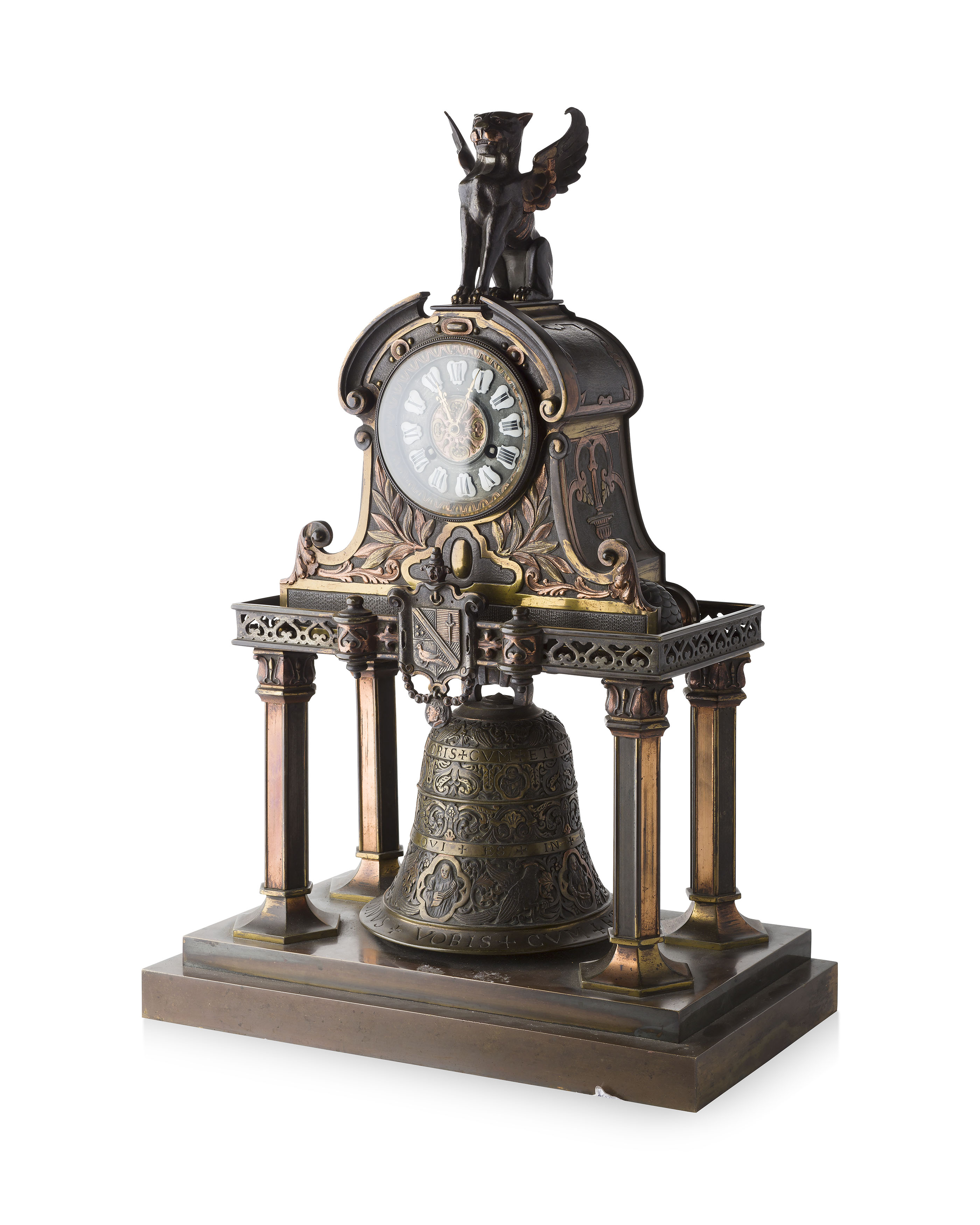 in the Baroque style, the broken arch case set with white enamel numbers, surmounted by a winged lion and mounted with an armorial, raised on four hexagonal columns enclosing a large sacristy bell inscribed with three bands of Latin text, 'Pater noster, qui es in caelis'; 'Dominus vobiscum'; and 'Et cum spiritu tuo', on a stepped base; the eight day movement striking on a gong