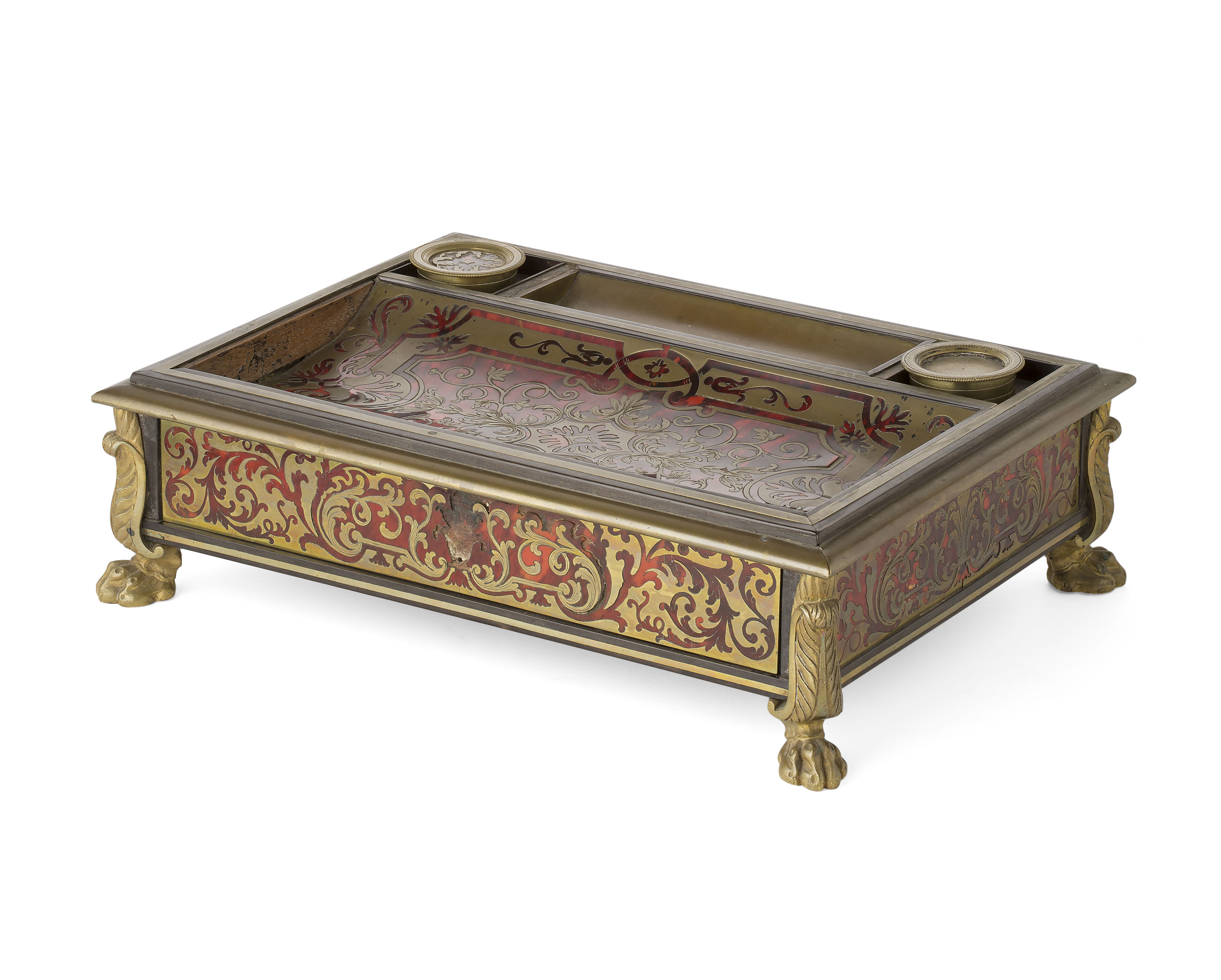of rectangular form, with a pen tray, two covered inkpot recesses, and a concave recess, raised on four gilt metal paw feet
