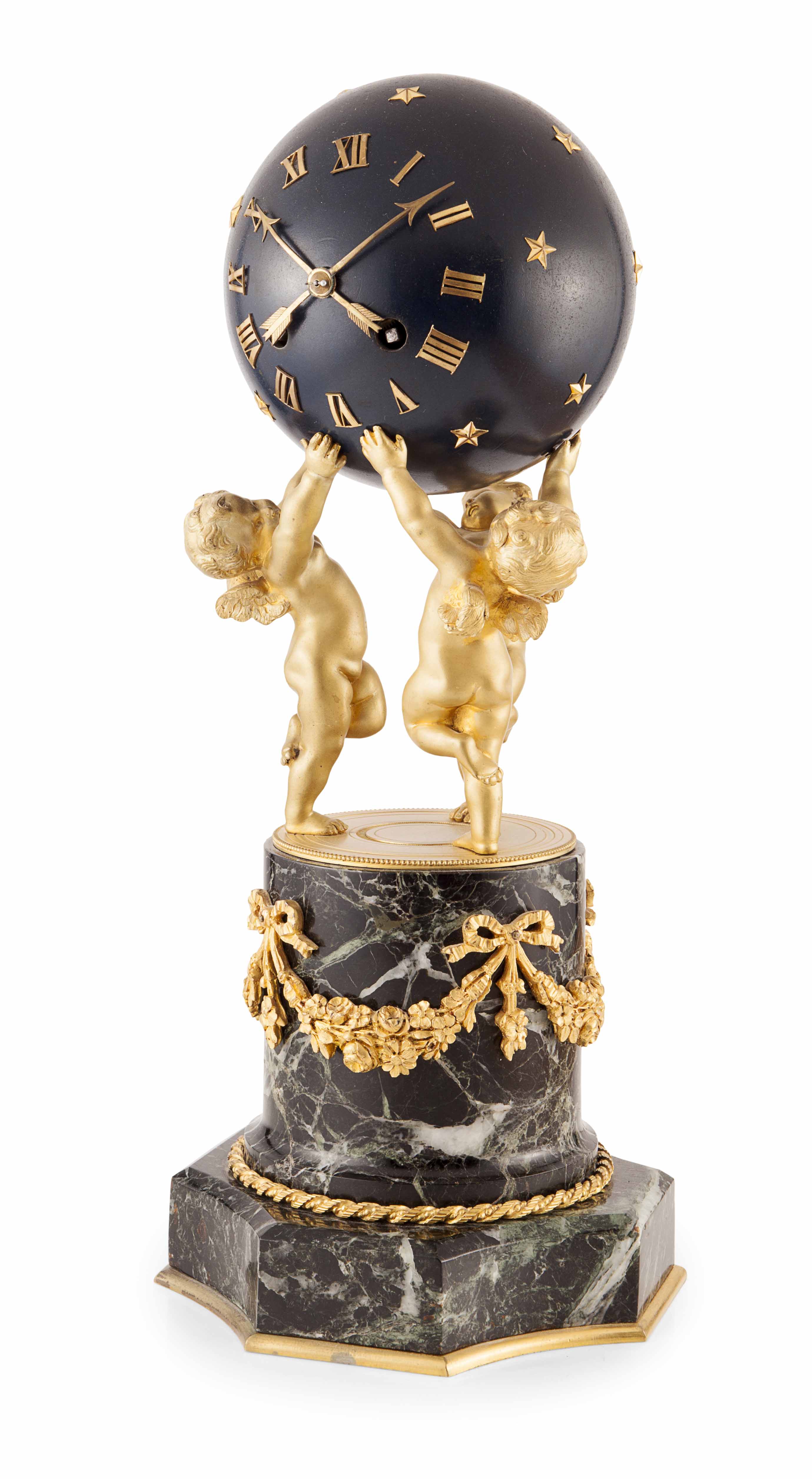 modelled as a patinated metal celestial globe with a Roman numeral dial supported by three gilt bronze putti, on a green marble column with gilt bronze floral swag mounts, and raised on a shaped octagonal base, the eight day movement striking a bell