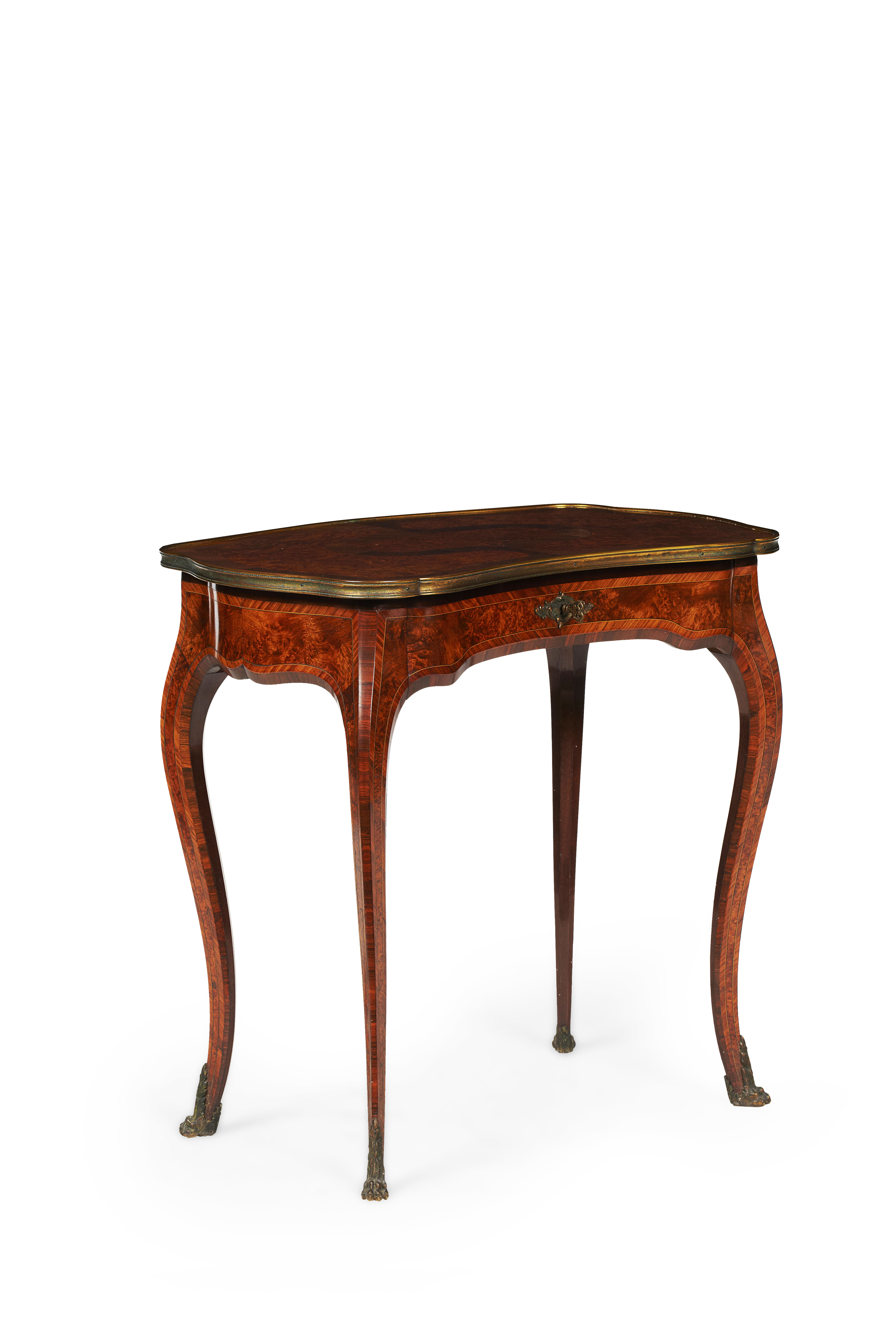 the shaped reniform brass banded top over a single frieze drawer, above a shaped apron, raised on chamferred square cabriole legs ending in lion paw sabots