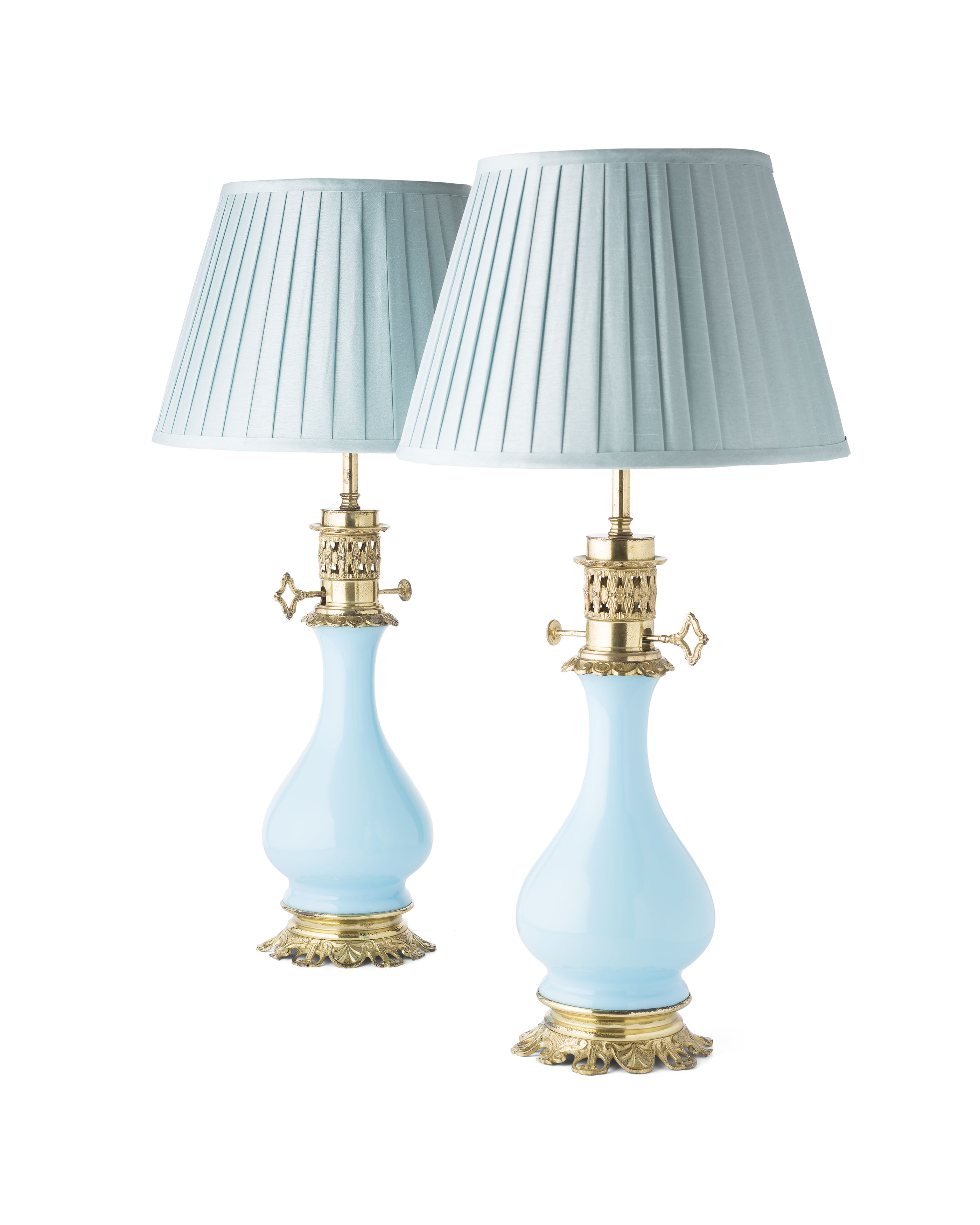 PAIR OF FRENCH OPALINE GLASS MODERATEUR LAMPS