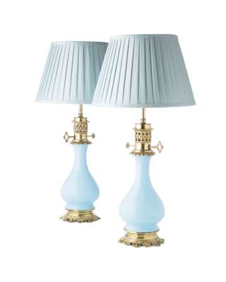 each baluster blue glass body with gilt metal fittings and base, with a pleated blue silk shade, converted from oil lamps (2)