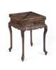 The pivoting square top with four triangular hinged panels carved with four coiling dragons opening to a playing surface, above a deep frieze carved with fruiting vines and with a short drawer to each side, raised on cabriole legs