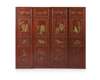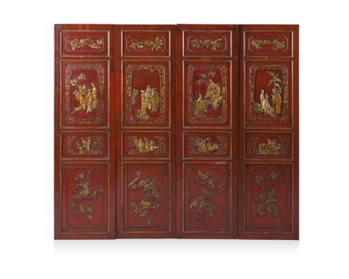 FOUR CHINESE CARVED, RED PAINTED AND PARCEL GILT PANELS