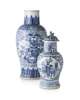 the first, a large baluster vase, decorated with panels depicting a bird amongst peonies, on a scrolling foliage ground, 58cm high; the second, of similar form and decoration with an associated domed lid, with panels depicting vases on stands, 42cm high (2)
