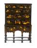 the moulded cornice over three short and three long drawers; the lower part with a frieze drawer flanked by deep drawers, raised on baluster legs joined by a shaped peripheral stretcher, decorated throughout with Chinese figures in landscapes