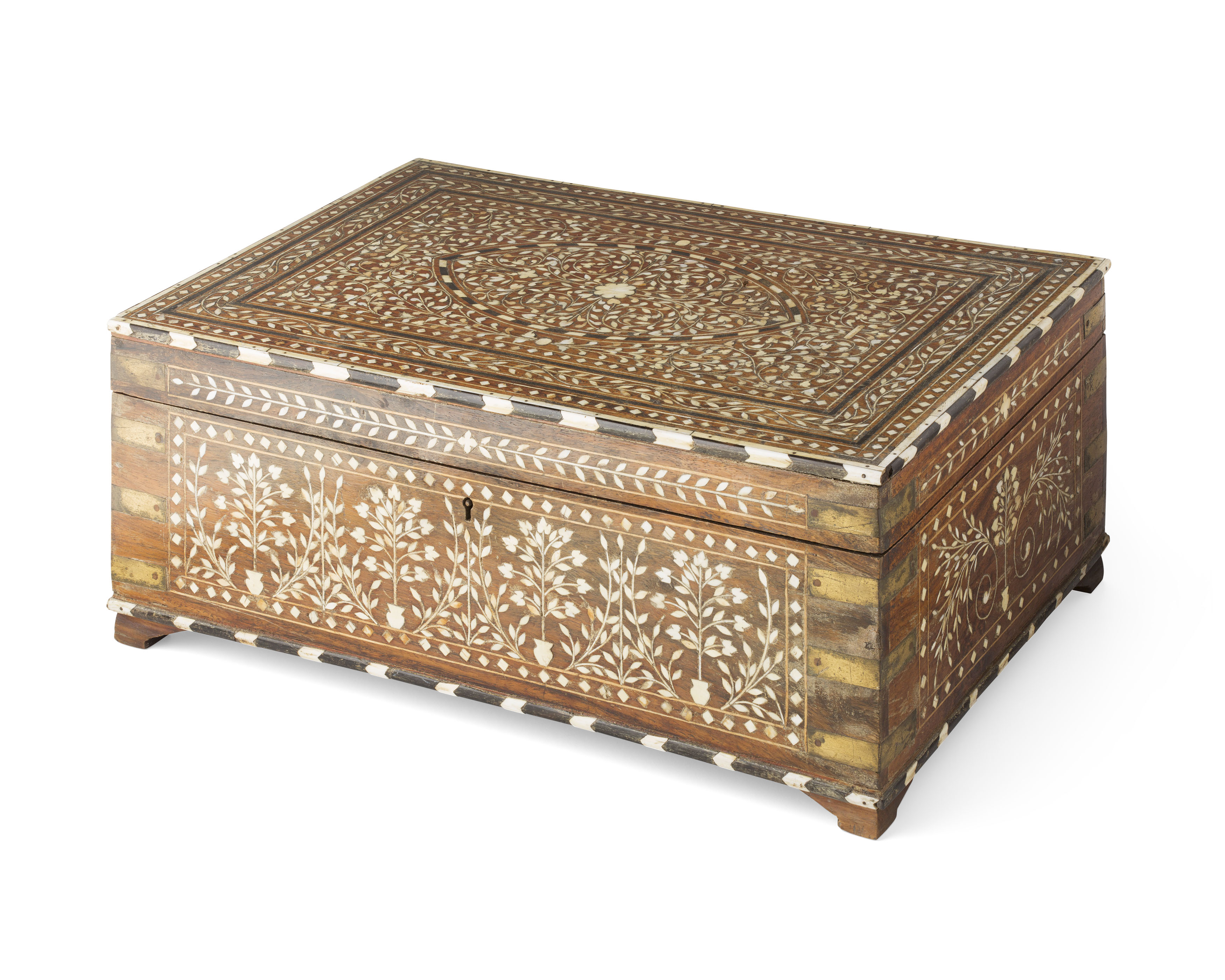 ANGLO-INDIAN ROSEWOOD, IVORY AND EBONY INLAID BRASS BANDED BOX Y
