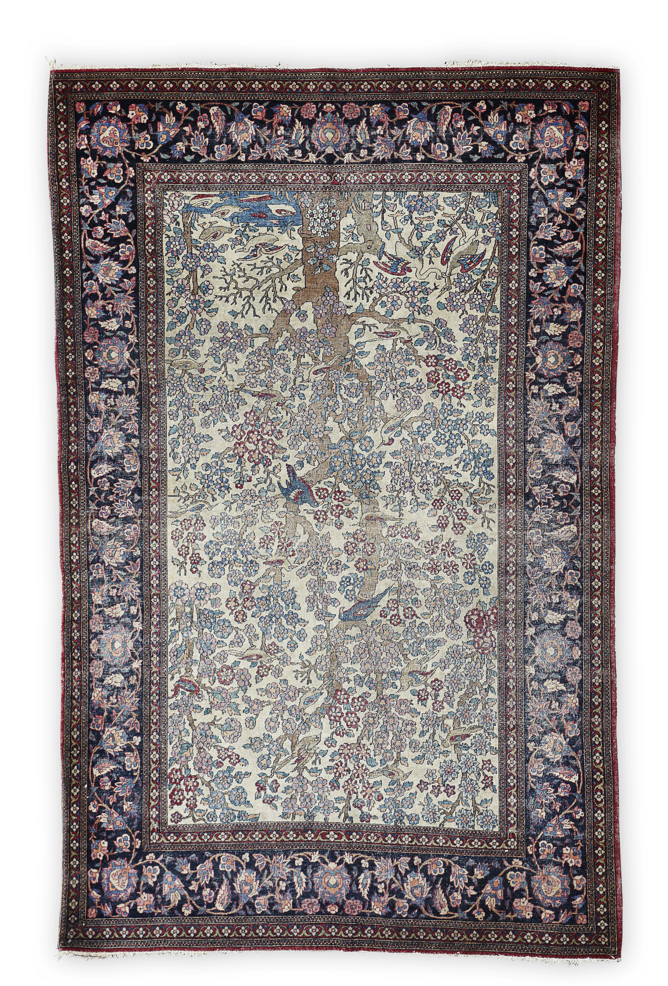the ivory field with bird filled tree of life pattern, within indigo palmette and vine border