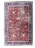 the burgundy field with foliate medallion flanked by cypress trees and buildings, within indigo foliate border