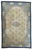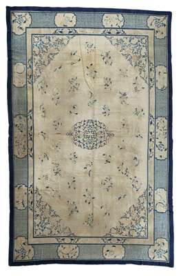 the cream field with a central indigo open vine medallion, similar spandrels, within cream lattice and floral cartouche border (reduced)