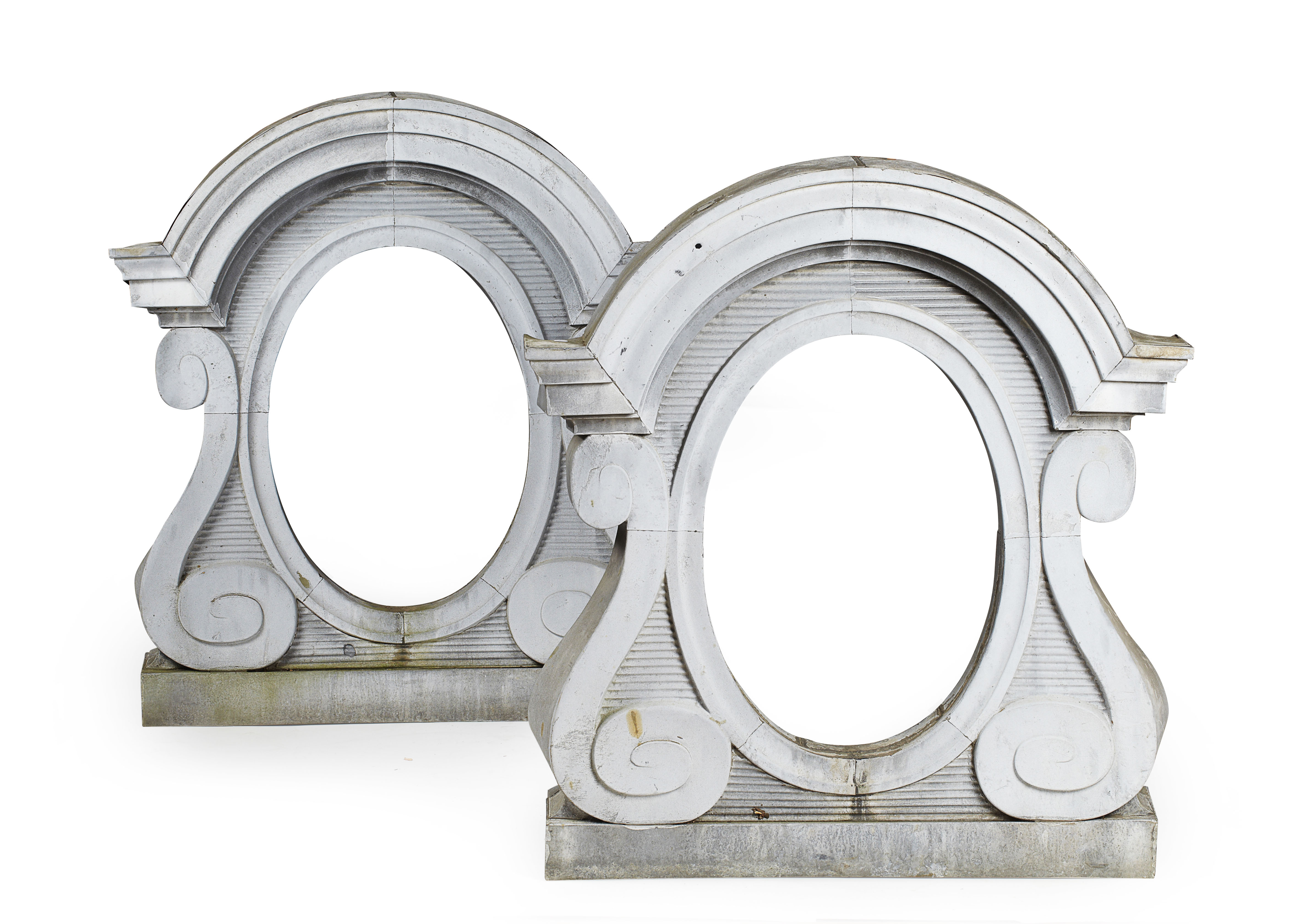 of moulded arched form with a central oval opening flanked by S scrolls (2)