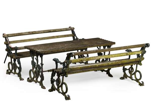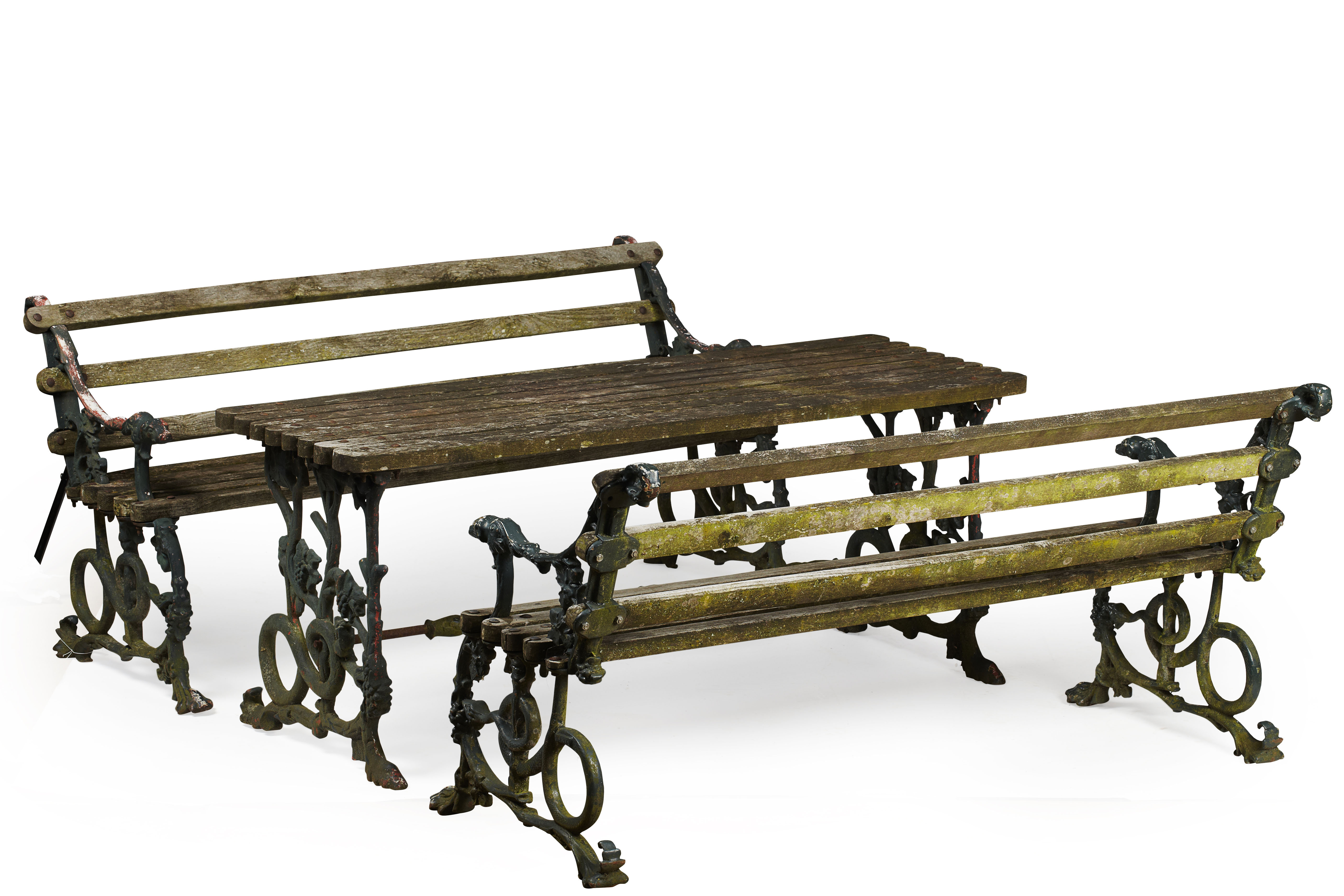 the green painted benches with wooden slat seats and backs, the ends cast with dog head hand terminals and entwined serpent and grapes; the table ends of a matching design (3)