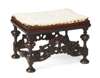 the rectangular padded seat over an ogee moulded seat rail, raised on baluster legs joined by carved and pierced arched stretchers, ending on flattened bun feet