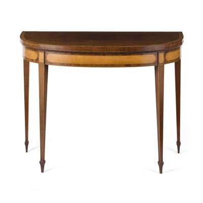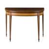 the D shaped crossbanded top with ebony and barber pole line inlay, above a frieze with oval reserves, raised on slender square tapered legs outlined in boxwood and ending in collared feet