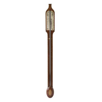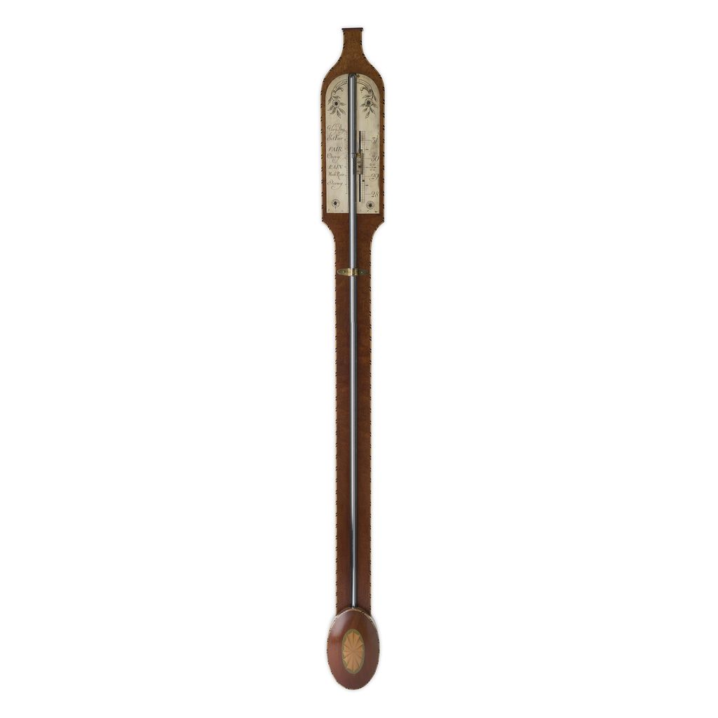 GEORGE III STYLE MAHOGANY AND INLAID STICK BAROMETER INSCRIBED 'RANSLEY, SEVENOAKS'
