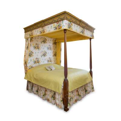 LATE GEORGIAN MAHOGANY, FRUITWOOD INLAY, AND POLYCHROMED FOUR POSTER BED