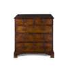 the crossbanded top above two short and three long graduated drawers, raised on shaped bracket feet