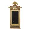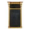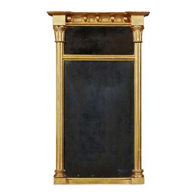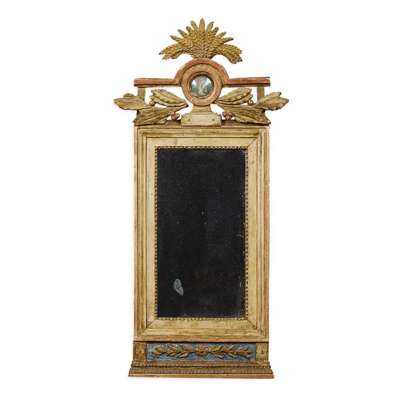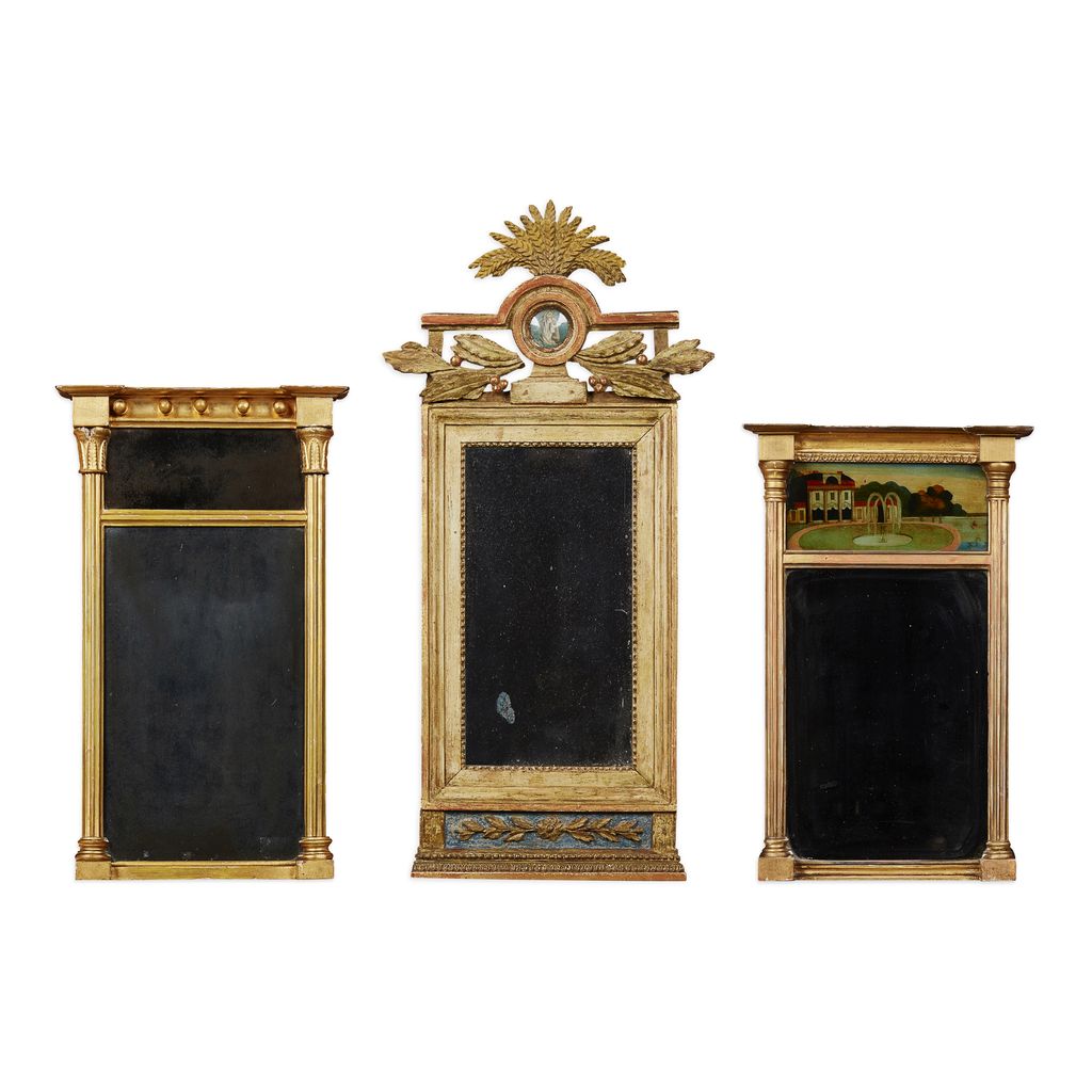 comprising a mirror surmounted with wheat sheaves and laurel branches and a small eglomise roundel, 84cm x 34cm; a mirror with an inverted breakfront cornice with applied balls above a divided mirror plate flanked by columns, 58cm x 35cm; and a mirror with an inverted breakfront cornice above an eglomise panel and mirror plate flanked by columns, 53cm x 30cm (3)