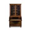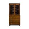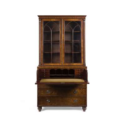 the moulded cornice above a pair of astragal glazed doors opening to shelves and flanked by spiral carved pilasters; the lower part with a long drawer fitted for writing above three long drawers, on turned feet