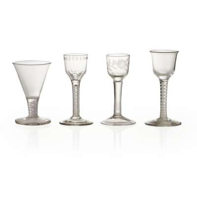 comprising an example with a cut glass ogee bowl, twist stem and plain foot, 13.5cm; a glass with an everted rim and opaque double twist stem, 14cm high; an example engraved with flowers and birds, 13.5cm high; and a small glass with a plain flared bowl and opaque double twist stem, 12cm high (4)