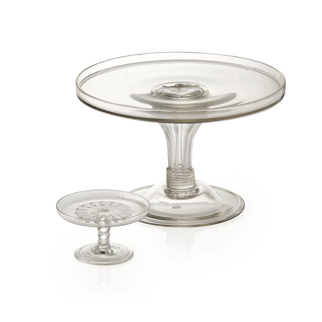 the plain tier with an raised lip, on a tapered moulded column with a ring banded base, above the domed folded foot, 30.5cm diameter, 19.5cm high; together with a SMALL GEORGE III GLASS TAZZA, of similar form, the plain tier supported by a fluted moulding raised on a knopped stem, above the folded foot, 12.5cm diameter, 7cm high (2)