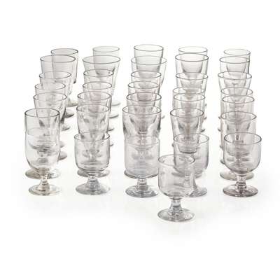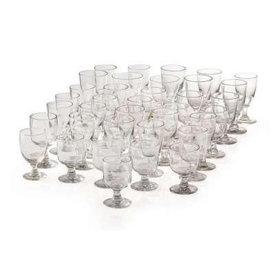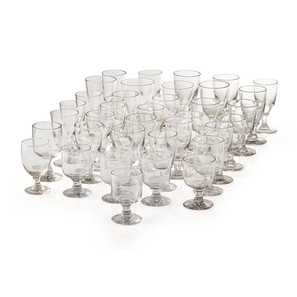 comprising thirty-six examples of various shape and size, with ovoid and round funnel bowls, one with a knopped stem, another with a faceted stem (36)