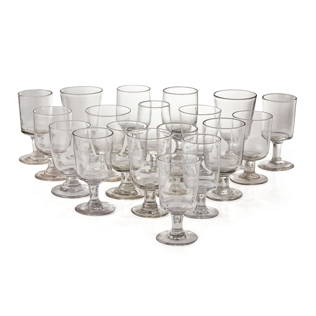 comprising nineteen examples of various sizes, the majority with bucket shaped bowls and plain stems, also including some with flared bowls and knopped blade stems (19)