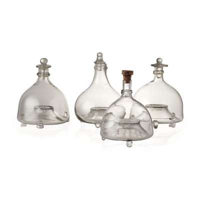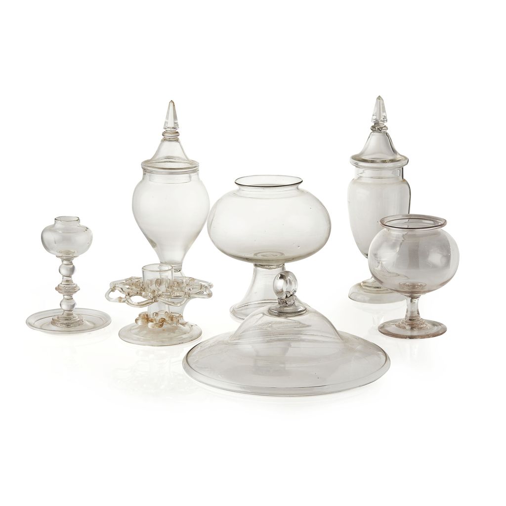 comprising a leech bowl with a flared folded foot, 22cm high; a smaller footed leech bowl, 18cm high; a lace maker's oil lamp, 18cm high; a smoke dome, 30cm diameter; a flower frog, 18cm diameter; and two footed jars with associated covers, one with a domed foot, the other with a folded foot, 33cm high; and four wasp traps of various sizes (11)