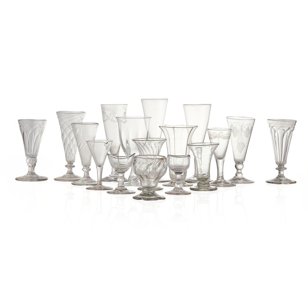 comprising seventeen examples, including some with wrythen moulded bowls, a jelly glass, three with etched bowls and two eye wash/bath glasses (17)