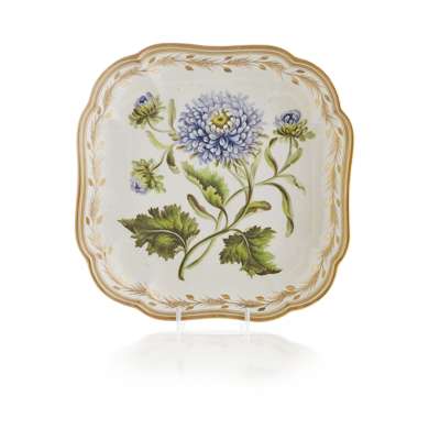 William 'Quaker' Pegg (1775 - 1851) worked as an apprentice studying porcelain painting from the age of 10. In 1796 he started working for the Derby factory, where he initially spent five years, before leaving and returning. His second time with the company saw new developments in his work, and this botanical dish is an example of the level of skill as a decorator and oberserver of botanical specimens. This 'Large Double China Aster', is thought to have originated from a hand-coloured etching included in John Edward's 'A Collection of Flowers...', which was originally published with 79 similar plates in January 1795. It is believed that Derby acquired a copy of this book in the mid 1790s, and it provided much inspiration for the factory's painters. A similar painted dish, also made and decorated at Derby, is held within the collection at the Victoria & Albert Museum in London.