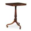 the rounded square top over a slender baluster support raised on bead and reel carved scroll legs ending on brass ball feet