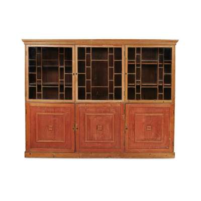 of low profile, the straight moulded cornice above three glazed and mullioned doors, above three cupboard doors with square moulded panels, with remnants of original red and ochre stained surface, on a plinth base