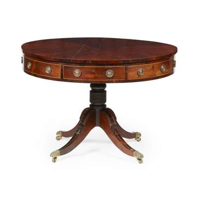 REGENCY STYLE MAHOGANY AND BRASS INLAY DRUM LIBRARY TABLE