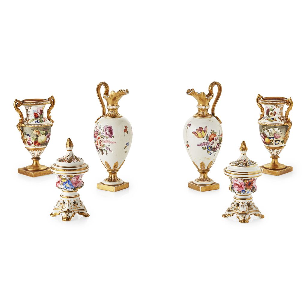 all painted with flowers and foliage, comprising a pair of Derby pastille burners, each painted with flowers and signed W.E.M (for W.E. Mosely), with red painted Stevenson and Hancock marks, 15cm high; a pair of campana urn form vases, with scrolled twin handles, 17cm high; and a pair of Bloor Derby ewers, each with a frilled spout, with printed maker's marks, 22cm high (6)