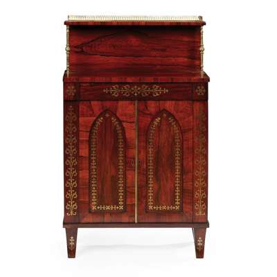 with an upper section with a pierced brass gallery and raised on turned baluster supports, above a pair of Gothic arch panel doors opening to a shelved interior, with scrolling foliate brass inlay, raised on sabre legs with further brass inlay