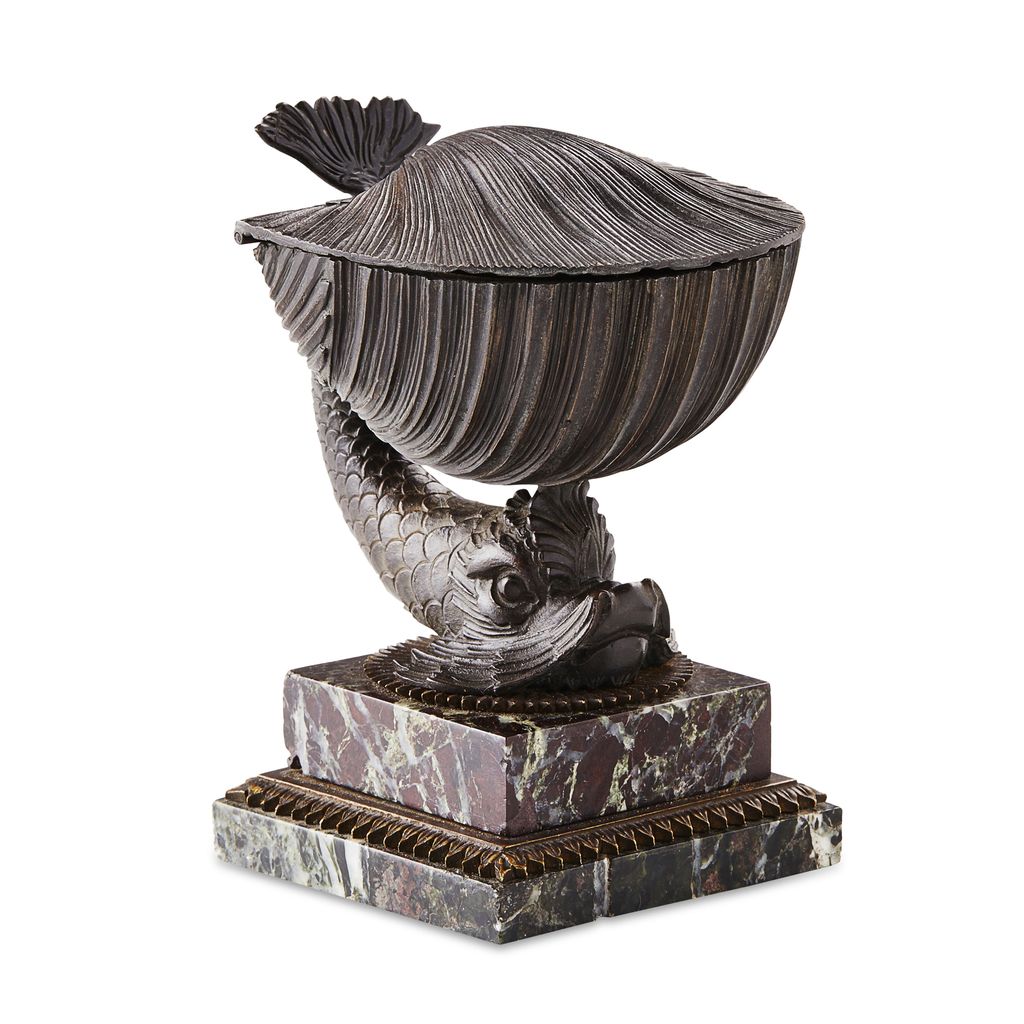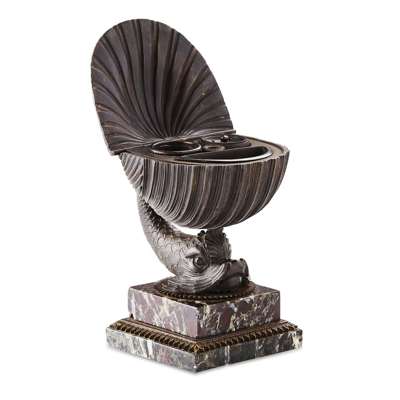 modelled as a hinged shell opening to ink and sand pots, supported on the back of a dolphin, on a square green/black veined marble stepped base