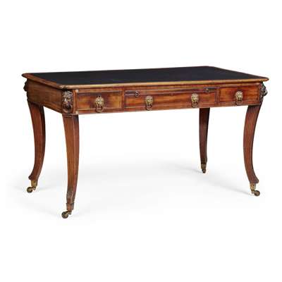 the rectangular top with notched corners and a black rexine inset writing surface, over a central slide and long frieze drawer fitted with a writing slope and flanked by short drawers, the same opposing, carved at the corners with lions masks, raised on reeded sabre legs ending brass caps and castors