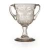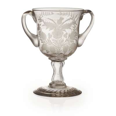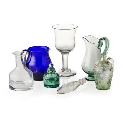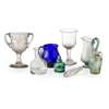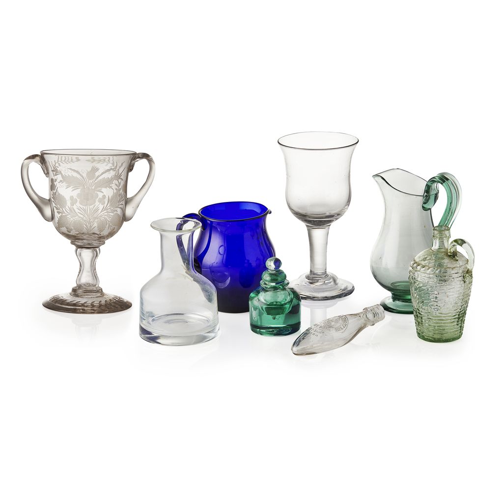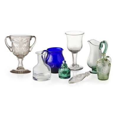 comprising an engraved twin handled goblet with the inscription A PRESENT FROM CHARLES WILD TO MARIA WOOD, 21cm high; a basket weave moulded green jug, with lozenge mark, 18.5cm high; a large stemmed goblet with a waisted bowl and domed foot, 27cm high; a Bristol blue jug, 18cm high; a pale green jug with a ribbed handle, 24.5cm high; a mallet shaped decanter, 19cm high; a green inkwell and stopper, 12.5cm high; and a moulded bottle with inscribed S. MAW. SON & THOMPSON, 19cm long (8)
