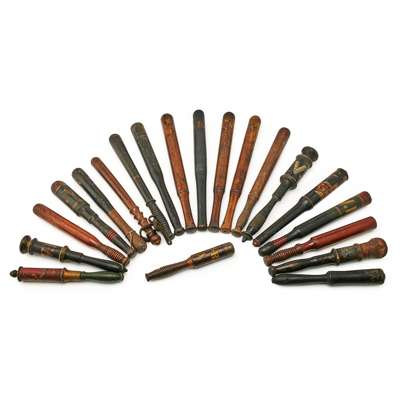 various shapes and sizes, sixteen examples with polychrome decoration and insignias, the remaining of plain turned wood (20)