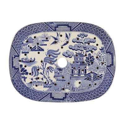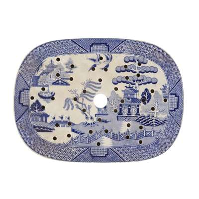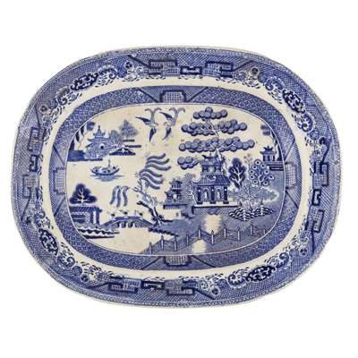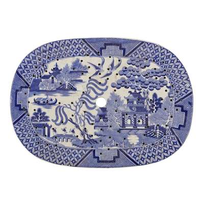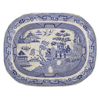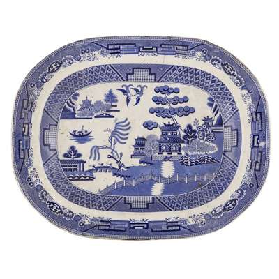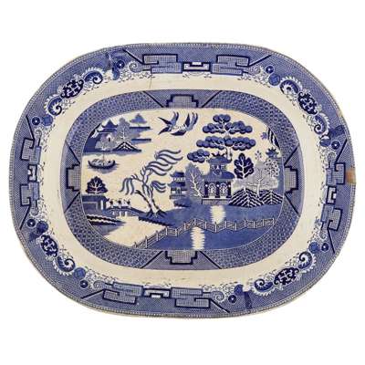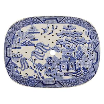 GROUP OF ENGLISH 'WILLOW PATTERN' TRANSFERWARE PLATTERS AND DRAINERS