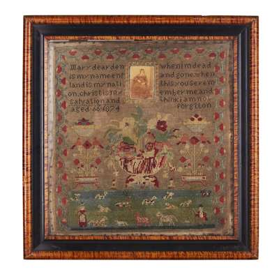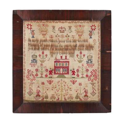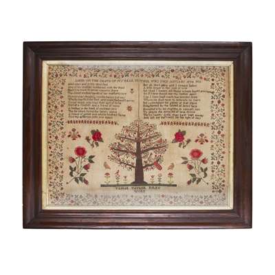 worked in silk on linen, with a two column verse titled 'LINES ON THE DEATH OF MY DEAR MOTHER WHO DIED JANUARY 16TH 1832', above an apple tree with peacocks, flowers, and further songbirds, inscribed 'TAMAR TAYLOR RILEY / WORK', in a wide scrolling flower border, glazed and framed; together with an ENGLISH NEEDLEWORK HOUSE SAMPLER, by Mary Copley, aged 13 and dated 1821, worked in silk and wool with a verse above a red house flanked by footmen, the ground filled with flowers, birds, baskets, a crown and trees and 'Noah's Ark' in two places, glazed and framed, 56cm high, 53cm wide; and a VICTORIAN MEMORIAL SAMPLER, by Mary Dearden, aged 66 and dated 1874, worked in wool with a two column verse centred by a mounted photograph of the maker, above a flower-fille bowl flanked by baskets and birds and flowers, above a field filed with animals and a shepherd and shepherdess, within a strawberry vine border, glazed and framed, 49cm high, 46cm wide (3)