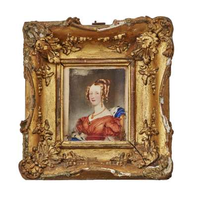 rectangular on ivory; the sitter with blonde hair and wearing a coral coloured gown, gold drop earring and necklace with pendant; sitting on a gilt chair with an blue velvet and ermine throw, signed upper left corner, in a gilt metal slip and gesso and giltwood frame; 10.5cm high, 8.5cm wide; together with a 19TH CENTURY PORTRAIT MINIATURE OF A YOUNG LADY with black hair wearing a dark gown, gold bracelet and ring and holding a book, on ivory, unsigned, in a gilt metal slip and red morocco leather case, 10cm high, 7.5cm wide (2)